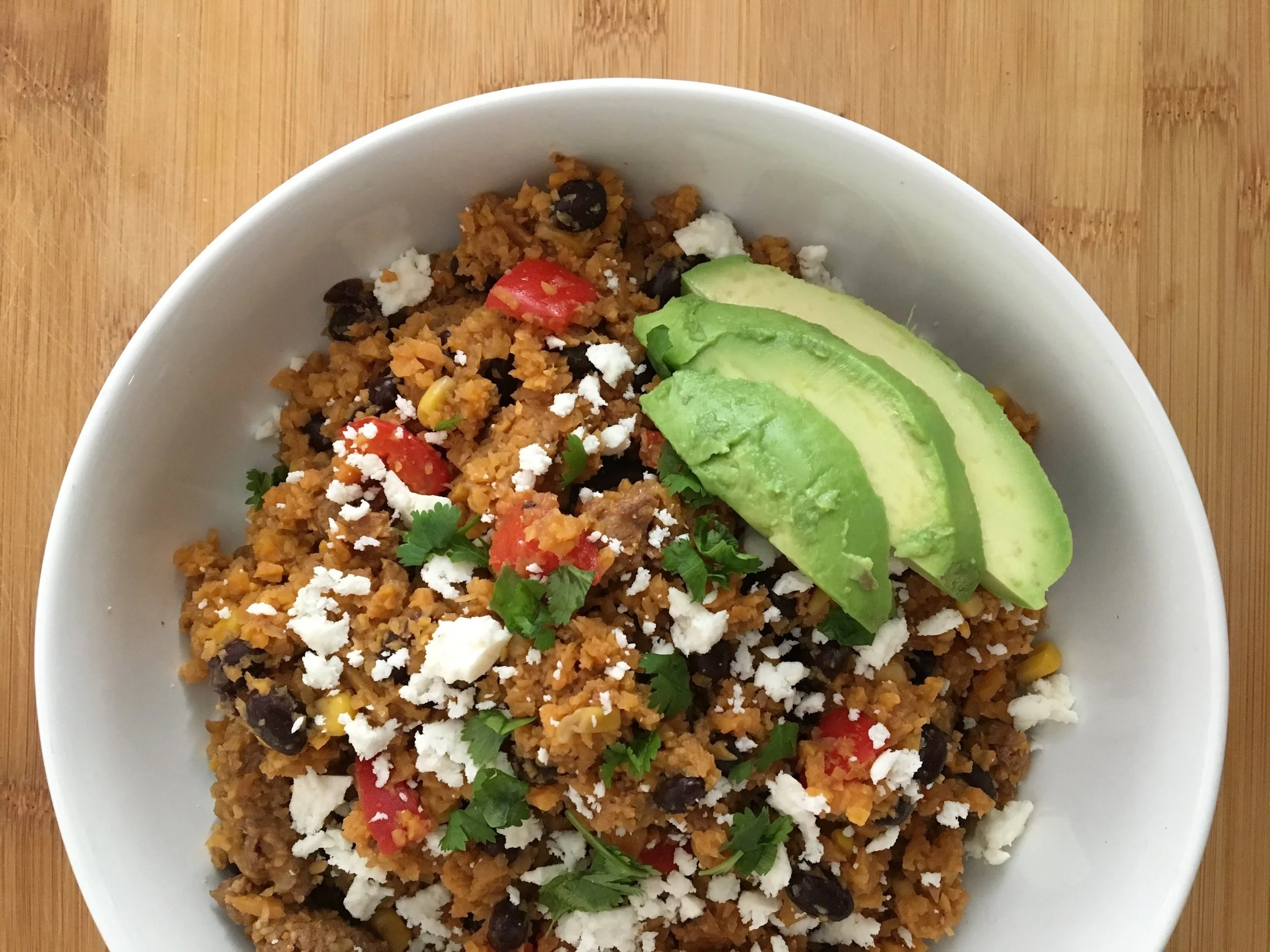 - Drain the extra grease in the skillet, and return it to the heat with your riced sweet potato, chicken stock, cumin and red pepper. Cover and allow to simmer for about 15 minutes or until the rice softens.